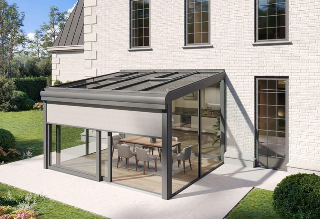 Markýza na skle - Venkovní elektrická markýza na zimní zahradu heroal HS odráží a pohlcuje sluneční záření ještě předtím, než dopadne na skleněnou střechu, a účinně tak zabraňuje zahřívání zakrytého prostoru.