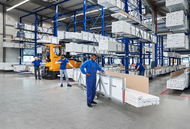 Seit der Inbetriebnahme im Jahr 2011 sind die beiden vollautomatischen Hochregallager das Herzstück des Zentrums: eines ist für die Lagerung von Profilen in Langgutpaletten ausgelegt, das andere für Zubehör auf Euro- und Gitterboxpaletten. Der computergesteuerte Prozess gewährleistet eine präzise, schnelle und zuverlässige Bearbeitung sämtlicher Aufträge im 159 Meter langen, 44 Meter breiten und 31 Meter hohen Komplex.