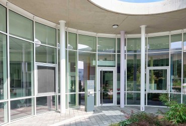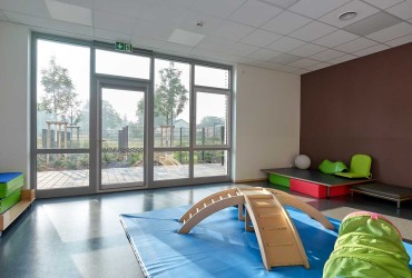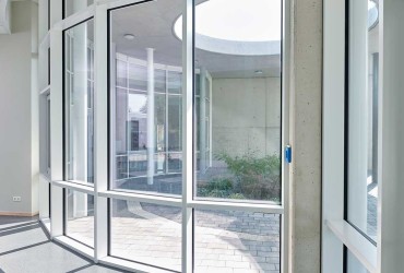 Um das Tageslicht bestmöglich nutzen zu können und eine gesunde Spiel- und Lernumgebung mit freiem Blick auf das Außengelände zu ermöglichen, wurden die Räume der Kindertagesstätte offen gestaltet und unter anderem mit Aluminium-Fenstern inklusive Ober- und Unterlichtern sowie Festverglasung ausgestattet. Bei der Planung des Gebäudes setzten die Architekten der ProZent GmbH zudem auf organische Rundungen, die u. a. mittels einer segmentierten Fassade realisiert wurden. Durch die Fassadenintegration des Fenstersystems heroal W 72 sowie der Türsysteme heroal D 65 C und heroal D 72 in die Pfosten-Riegel-Konstruktion des Fassadensystems heroal C 50 konnten verschiedene heroal Systeme im Innen- sowie Außenbereich kombiniert werden.