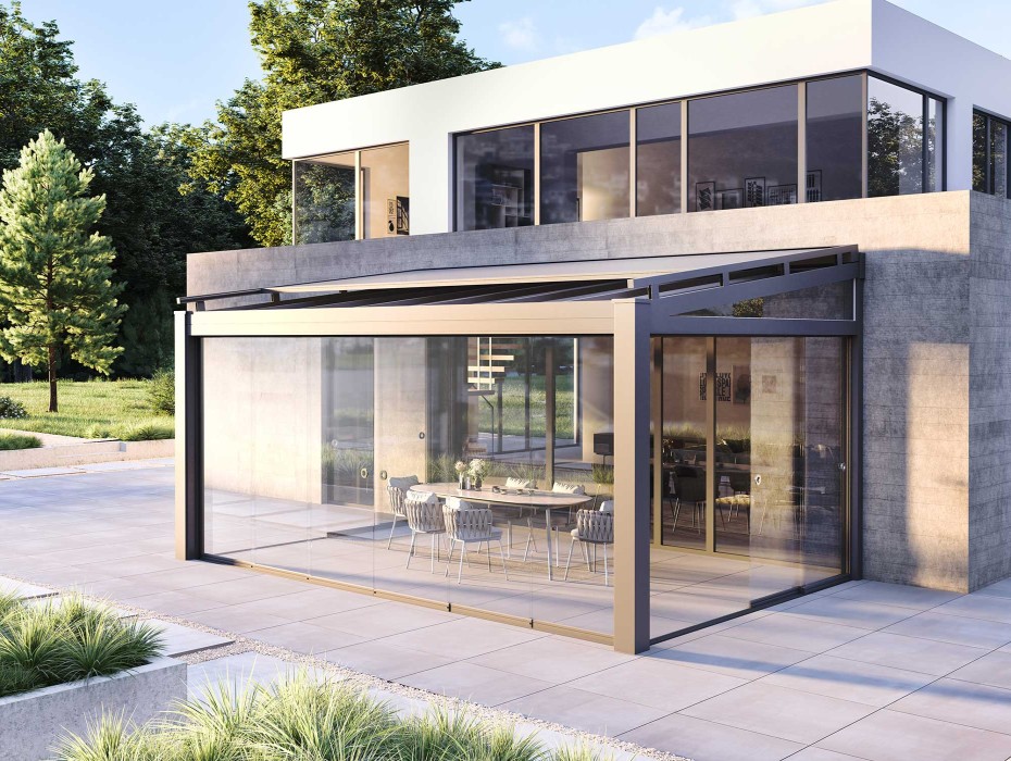 The non-insulated aluminium sliding door system heroal S 20 C makes it possible to use covered outdoor areas regardless of wind and weather. Frame connectors, adjustable slide mechanisms and glass clampings ensure a fast and easy manufacture. The sliding door system heroal S 20 C offers a variety of opening types. The frameless sashes and a accessible threshold lend this sliding door a very elegant design and maximum transparency. Closing the elements is made easy and comfortable by means of sliding dampers, which act like a cushion and make sure that the elements are pulled into their final position safely. In addition, element carriers and durable stainless steel guide rails guarantee a durable, very comfortable operation. Cleaning is made easy by an integrated dirt drain. A locking set consisting of a locking bolt for locking the active leaf and a fastening set for locking the outer leaf is also available for heroal S 20 C.