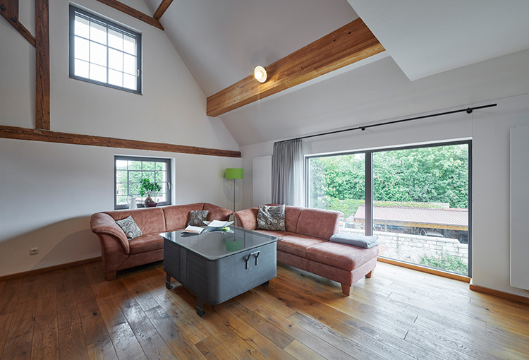 The historic building, which is now a highlight of the Untersteinbach town centre, situated in the Lower Franconian district of Haßberge, had previously lain dormant for decades. Working on behalf of the brewery’s owner Georg Zeck, in 1928 the architect Karl Rüttinger took over the design and construction of the brewery’s premises. But after its sale in 1950, the distinctive building with arched windows increasingly fell into disrepair until accountant and current owner Olaf Ernst became fascinated by the building: as a member of the municipal council for the area, he was very passionate about the preservation of the historic structure. Family ties – Olaf Ernst is the great-grandson of the architect who designed the building – were an additional motivating factor. His redevelopment concept, which provided for the heritage-protected brewery to be converted to an accountant’s office and three holiday apartments, convinced the council and the Bavarian Ministry of the Interior of his plans.