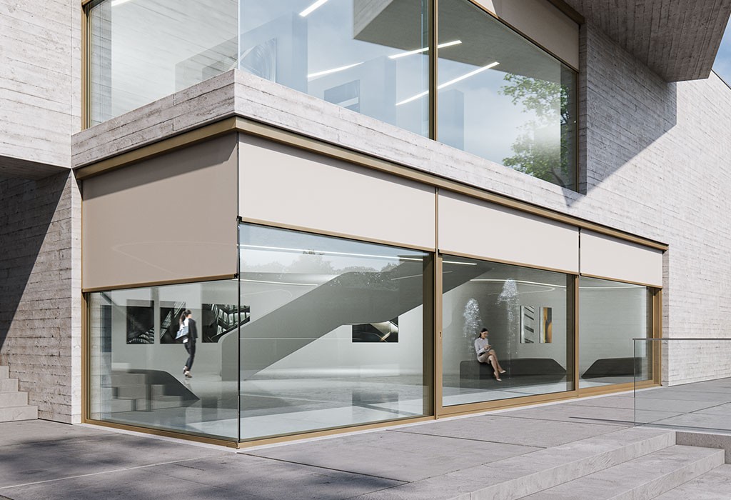 En plus des avantages fonctionnels, la solution d'angle heroal VS Z se distingue aussi par des aspects esthétiques. Pour le choix de l'écran textile, environ 250 toiles sont à disposition par défaut – de versions quasiment transparentes pour la lumière du jour à l’intérieur du bâtiment et une vision libre sur l’extérieur jusqu’à des modèles opaques pour un obscurcissement quasi total. Le guidage par câble en acier inoxydable assure un raccord en filigrane de l’écran textile d’angle. Le design de qualité supérieure est renforcé en outre par le guidage de toile latéral dans les rails de guidage avec une vue particulièrement fine de seulement 25 millimètres. Sur demande, les rails de guidage peuvent être entièrement encastrés. Le laquage des composants extrudés avec le revêtement par poudre hwr heroal hautement résistant aux intempéries créé une liberté d'agencement supplémentaire.