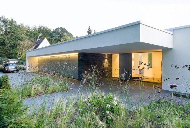 Dopo una fase di progettazione e di costruzione della durata di due anni, sui 2.000 m² di terreno leggermente scosceso della villa di un ex imprenditore, è sorta una nuova costruzione moderna di due piani progettata dagli architetti dello Studio di architettura oxen di Colonia in perfetta armonia con i desideri dei nuovi proprietari. Oltre a un impiego sostenibile delle risorse e dei materiali, l’obiettivo è stato creare un’architettura dell’edificio trasparente che non fosse visibile dalla strada e che offrisse la possibilità di ritirarsi in un luogo protetto durante la quotidianità, attraverso un’abile organizzazione dei differenti spazi. “Nel soggiorno si riunisce tutta la famiglia, ma ognuno ha una personale oasi privata. Le camere dei bambini sono al piano inferiore, come anche una stanza per gli ospiti e una sala hobby oltre all’area wellness con sauna. Anche la camera padronale è separata dagli spazi comuni dall’ingresso”, spiegano il proprietario.
