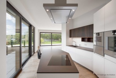 On the ground floor, the lifting-sliding door system heroal S 77 HI provides for a free access to the garden and an unencumbered view of the lake on two sides of the open-plan living area. To meet the demands of the building owner, the glass surfaces were to be planned very generously, while at the same time providing for efficient energy consumption values. The lifting-sliding door system heroal S 77 HI meets both requirements: thanks to the perfect sealing technology with four different levels and wind stop for sash and centre joint, the thermal insulation values of this lifting-sliding door system are excellent – while still providing for unobtrusive face widths of the aluminium frames. This system by heroal also stands out for its high ease of use, even for large elements.