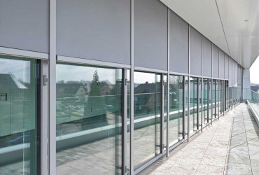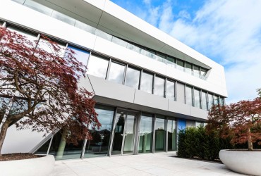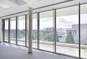 Light slabs of stone, lined by green hedges and Japanese maple, lead the visitor to the fully accessible entrances of the building. In order to ensure barrier-free access to the heroal Forum, door systems with a level, step-free threshold were installed. Since the entrance is situated at the weather side of the building, it was a challenge to protect it against the elements. The patented, seamlessly integrating drainage system heroal DS solved this problem: it creates fully accessible, step-free solutions, meeting the statutory regulations for accessible construction according to German industry norm DIN 18040-1 for public buildings and DIN 18040-2 for dwellings.