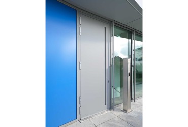 The heroal Les Couleurs® Le Corbusier front door directly leads to the staircase area. The residential and commercial front door system heroal D 72 is designed as floor to ceiling element, measuring 2,950 mm high and 1,300 mm wide. With the restrained colouring using the Les Couleurs® Le Corbusier shade gris 31 for door panel and handle, it unobtrusively blends in the building shell.