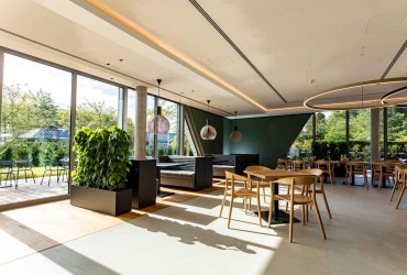 The automatic door system made from the door system heroal D 65 provides convenient and barrier-free access to the building and also serves as a wind lobby for the adjacent bistro area, where culinary and regional dishes are freshly prepared. Employees and guests of the company enjoy the daily changing dishes on offer and also use the heroal Bistro and the adjoining patio to relax or exchange ideas across departments.