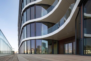A dream come true for planners, builder-owners and partners: A curtain wall with uncomprisingly efficient energy values and flexible design options. The curtain wall system heroal C 50 HI achieves excellent values for ventilation, thermal insulation and tightness, which is a most important aspect for an office building of this size. The curtain wall system by heroal leaves much freedom for individual design options. The special feature: the post-transom curtain wall is designed with a radius, so that it is slightly curved. The ventilation flaps heroal W 72 VF with their wooden look set a visual accentuation in the curtain wall of Kotelna Park II – made possible by the coating technology heroal Surface Design (SD). This feature lends individuality to this harmoniously designed curtain wall.